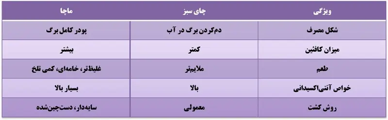 اگرچه ماچا و چای سبز از یک گیاه (Camellia sinensis) به دست میآیند، اما تفاوتهای مهمی با هم دارند: