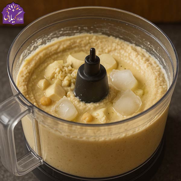 مخلوط کن را شروع کن به زدن؛ اگر خیلی غلیظ است، کمی از آب نخود یا آب سرد به آن اضافه کن تا به غلظت دلخواه برسی. غلظت باید طوری باشد که با قاشق کشیده شود اما خیلی روان نشود.